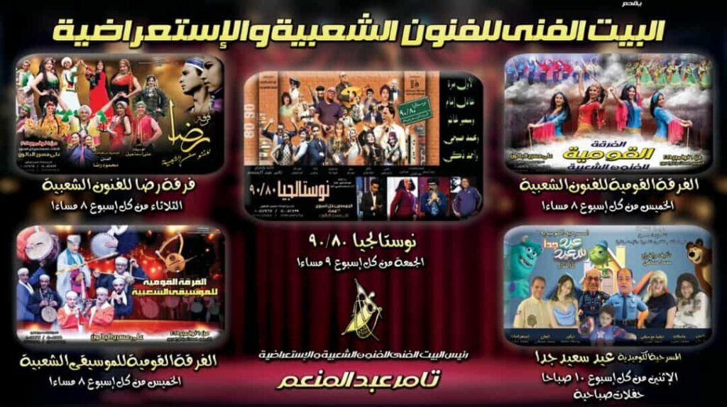 وتختتم فاعليات الأسبوع بالعرض المسرحي الإستعراضي نوستالجيا ٩٠/٨٠ وذلك يوم الجمعة من كل أسبوع، مسرحية “نوستالجيا ٩٠/٨٠” بمشاركة فرقة رضا للفنون الشعبية والإستعراضية وفرقة بورسعيد للفنون الشعبية بطولة الفنان تامر عبدالمنعم إعداد موسيقى وألحان محمد مصطفى إضاءة عز حلمي ماكياج إسلام عباس رؤية وإخراج تامر عبدالمنعم.