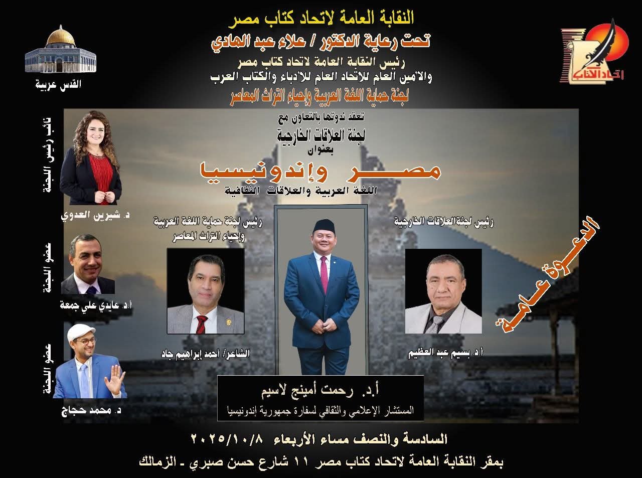 تحت رعاية معالي الأستاذ الدكتور.. علاء عبد الهادي رئيس النقابة العامة لاتحاد كتاب مصر والأمين العام للاتحاد العام للأدباء والكتاب العرب تعقد لجنة حماية اللغة العربية وإحياء التراث المعاصر برئاسة الشاعر ..أحمد إبراهيم جاد. ونائب رئيس اللجنة الدكتورة شيرين العدوي ندوتها بالتعاون مع لجنة العلاقات الخارجية برئاسة د بسيم عبد العظيم بعنوان ..مصر وإندونيسيا . اللغة العربية والعلاقات الثقافية ضيف الندوة ..الدكتور ..رحمت أمينج لاسيم ..المستشار الإعلامي والثقافي لجمهورية إندونيسيا بالقاهرة . وذلك يوم الأربعاء القادم الموافق 8 أكتوبر 2025 في تمام السادسة والنصف مساء .